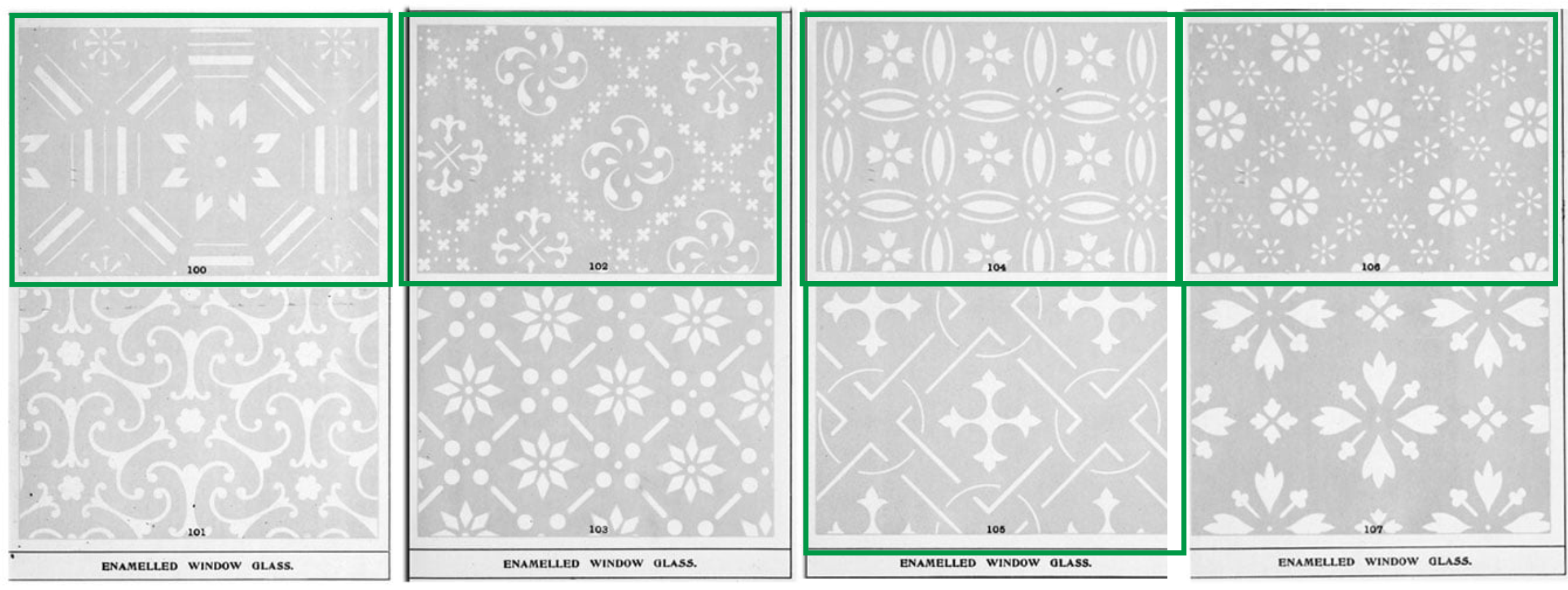 To the left, you’ll see a selection of traditional acid-etched glass patterns taken from older catalogues.