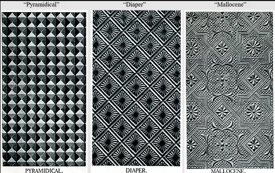 From around 1890 onward, we have much clearer information about the glass products available. The following section presents a collection of known patterns, with dates indicating either the registration date of the design or the publication date of the source image. These dates may differ from the earliest period of manufacture, as many popular patterns remained in production for decades.